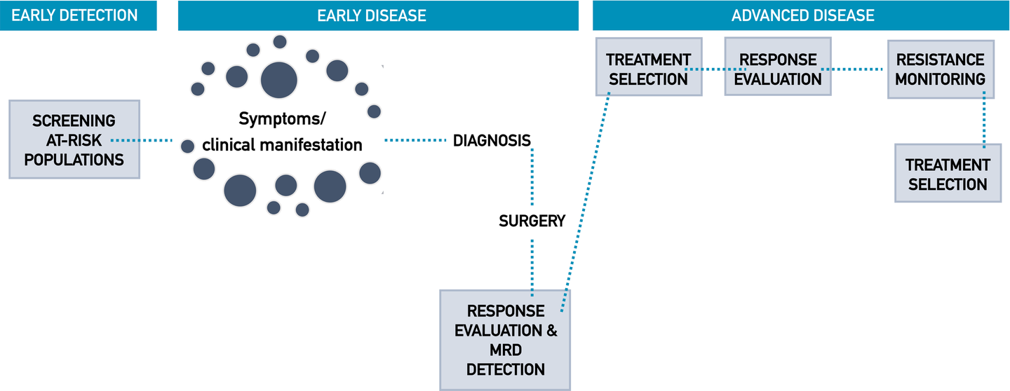 In addition to their eased access, liquid biopsies may capture the tumoral spatial heterogeneity not observed from traditional single-site biopsy genotyping, as they may enable the detection of DNA shed from both clonal and subclonal sites within multiple metastatic lesions. An array of studies has established the general concordance between aberrations detected in ctDNA and tumor tissue, ranging approximately between 70 and 90%. Some discordance between mutations identified in primary tumor tissue and ctDNA is to be expected, which can be attributed to tumor heterogeneity or evolution, sampling bias, time lapses between sample acquisition, differences in sensitivity of the sequencing assays applied, or even different sequencing platforms. However, with suitable and validated workflows, the potential applications of ctDNA are far-reaching, including diagnosing cancers earlier than traditional imaging, customizing treatments detected via genotyping, associating DNA levels with response to treatment, identifying mechanisms of resistance to therapies and measuring minimal residual disease after treatment. As new evidence of analytical validity, clinical validity as well as utility continues to accumulate for these applications, strategies and requirements for the integration of ctDNA analysis workflows into clinical oncology programs are taking form.